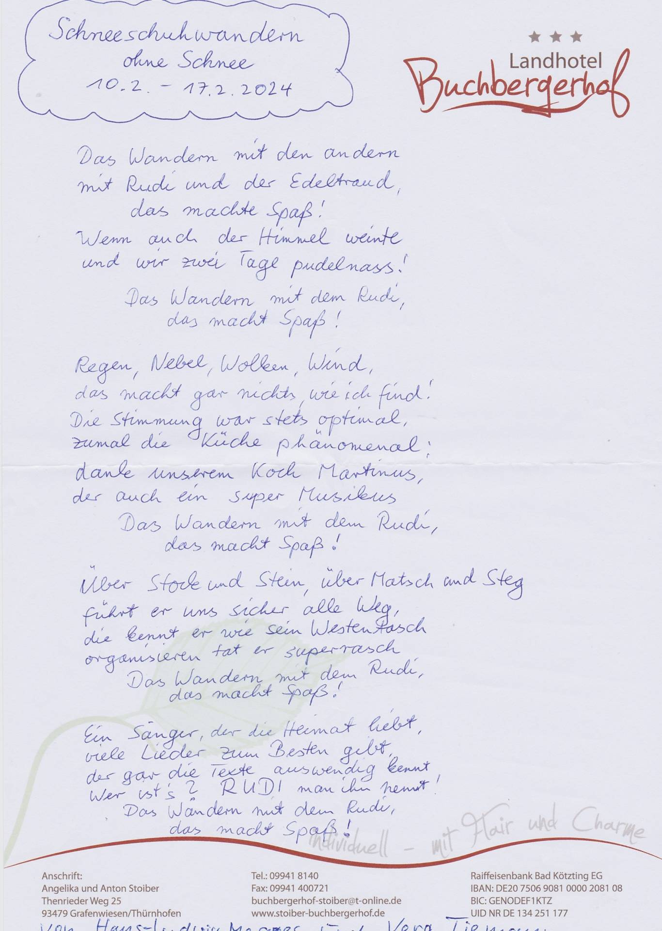 Meist starten die Wanderungen direkt vom Hotel oder nach einer kurzen Fahrt mit dem ÖPNV. Heimatgeschichten und -lieder mit Musik gehören dabei immer zum Programm. Die Wandergruppen sind inzwischen fester Bestandteil in unserem Jahr und wir hoffen mit diesem Jubiläum darauf, dass noch viele folgen werden!